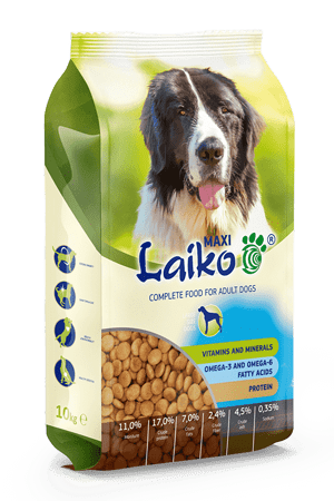 Laiko® Maxi High-quality, complete food for dogs of large breeds with complete growth, with a normal need for energy. A unique extruded mixture with a unique meat taste. Contains animal proteins, omega-3 and omega-6 fatty acids, vitamins and minerals necessary for the daily, balanced nutrition of your dog. Ingredients: whole grain wheat, poultry meal, grain components, poultry fat, liver hydrolyzate, salt /sodium chloride/, chalk /calcium carbonate/.